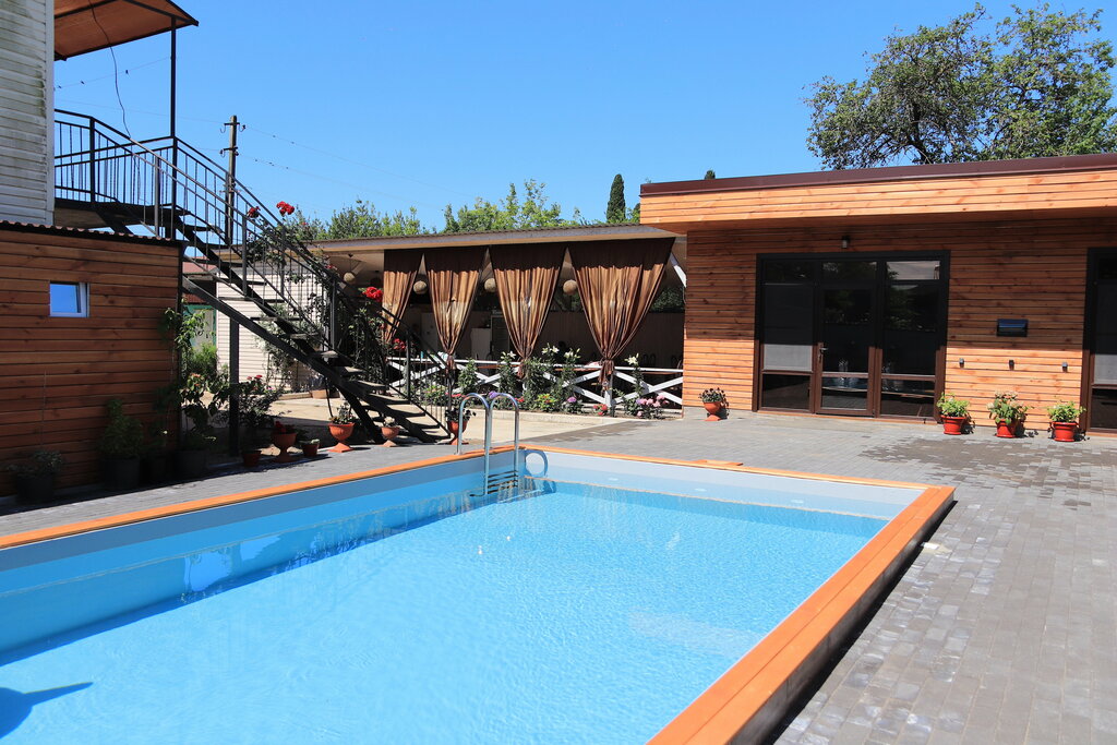 Отель позиционируется как семейный мини-отель категории «эко». По сути, это комплекс из нескольких одно- или двухэтажных корпусов, где номера больше напоминают апартаменты с собственной кухней. Ключевая особенность — наличие на территории бассейна с подогревом, который становится главным центром притяжения. Целевая аудитория — самостоятельные путешественники: семьи с детьми и небольшие компании, приезжающие в Абхазию ради моря и природы, готовые готовить себе еду самостоятельно.
