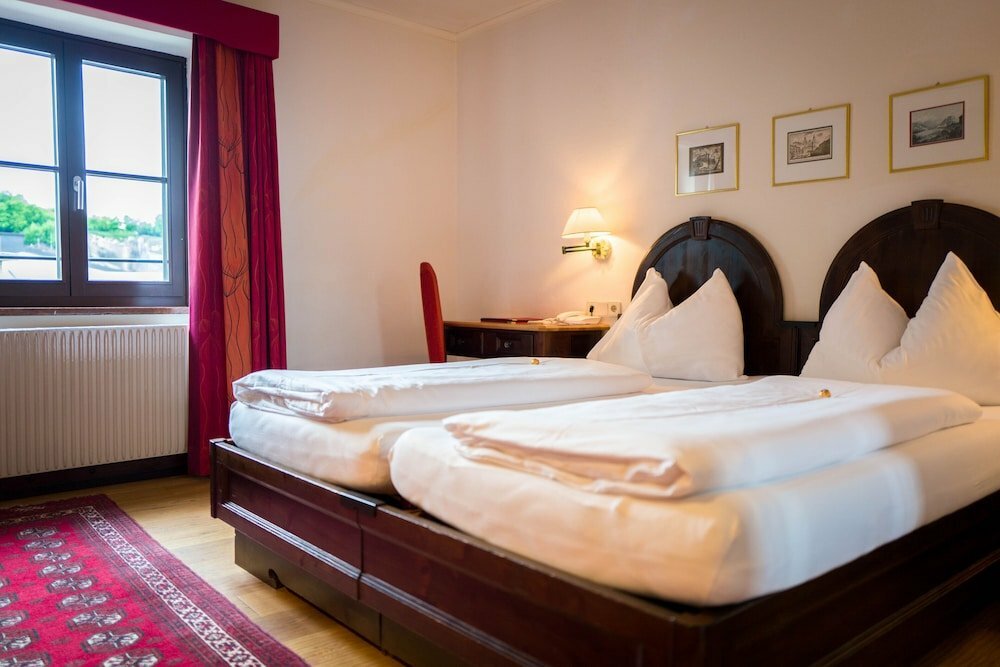 - Altstadthotel Stadtkrug — 4-звездочный отель в историческом здании с итоговой оценкой 7.5/10, где высочайший балл за локацию и завтраки снижается из-за тесноты и проблем с инфраструктурой.