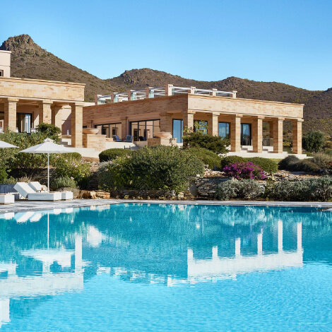 Описание: Cape Sounio Grecotel — это курортный комплекс, расположенный в семи километрах от центра Лавриотики на побережье Эгейского моря. Отель представляет собой обширную территорию с бунгало, разбросанными по склонам холмов в окружении соснового леса, и центральным зданием с ресепшен, ресторанами и барами. Архитектура выдержана в стиле, отсылающем к древнегреческим мотивам, с элементами колоннад и открытых портиков. В центре комплекса находится археологический участок с остатками древнего поселения III века, что усиливает исторический антураж.