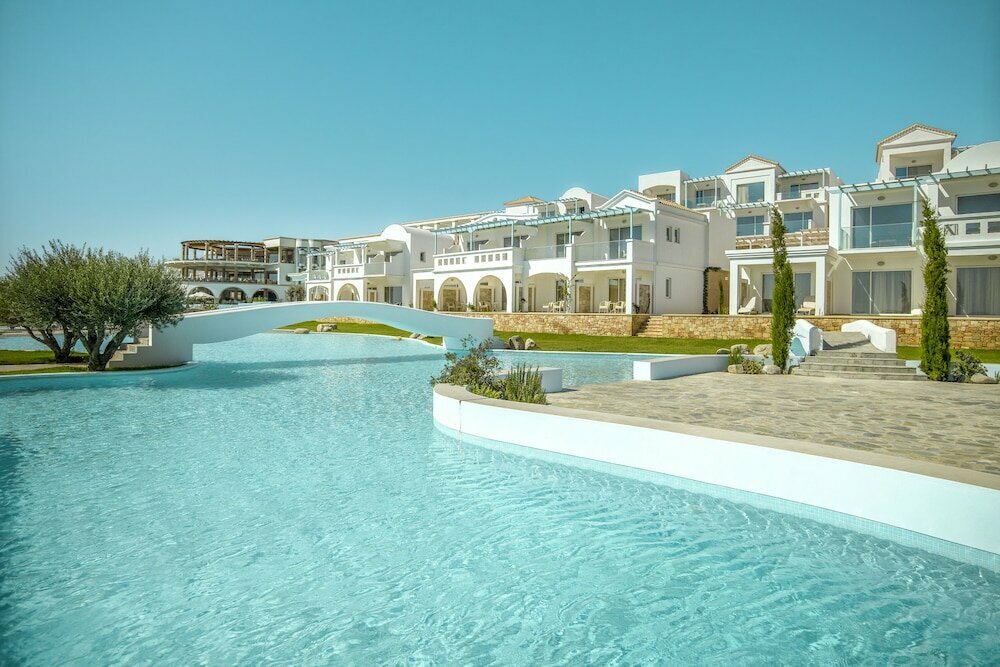 Описание Курорт представляет собой террасный комплекс, стилизованный под традиционное греческое поселение (белые домики, каменные стены, террасы, спускающиеся к морю). Отель позиционируется как место для уединённого отдыха с высоким уровнем персонализированного сервиса. Инфраструктура охватывает несколько бассейнов (включая приватные у бунгало), собственный галечный пляж, спа-центр, несколько баров и ресторанов, а также спортивные площадки (теннис, мини-гольф).