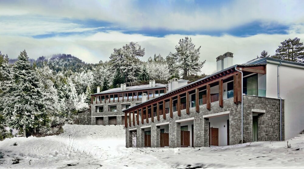 - Grand Forest Metsovo — дизайнерский горный эко-отель 5*, получивший итоговую оценку 8.5/10 за потрясающую архитектуру, слияние с природой и феноменальную кухню.