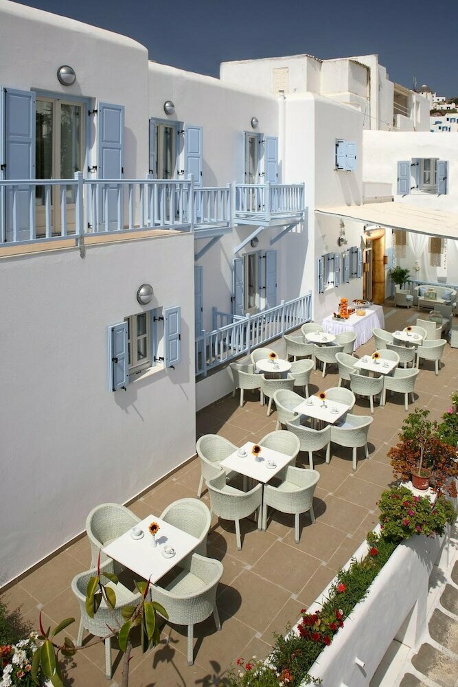Описание: Отель представляет собой компактную городскую гостиницу в традиционном кикладском стиле, расположенную в историческом центре главного города острова. Заявлен как 2-звёздочный, но благодаря недавнему ремонту производит приятное визуальное впечатление: современная мебель, светлые тона, аккуратный внутренний дворик и терраса для отдыха. Основная аудитория — молодые путешественники, туристы-«однодневки» (перед паромом) и те, кто приезжает на остров за ночной жизнью и шопингом.