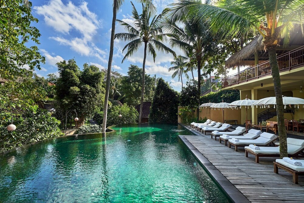 - Komaneka at Rasa Sayang — бутик-отель в центре Убуда с высокой оценкой 9.2/10, которую он получил благодаря исключительно дружелюбному, персонализированному сервису и идеальному расположению.