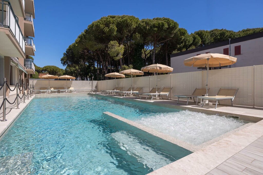 Расположение: Отель находится в районе Пинета (соснового бора) на окраине Лидо-ди-Езоло. Это спокойная, почти курортно-парковая зона, удалённая от центральных шумных улиц и вечерней «movida».