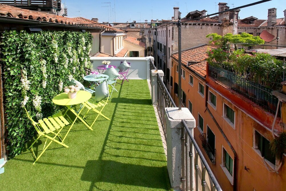 - Две террасы (альтаны): Главная особенность. Обе террасы стильно обставлены, с них открывается прекрасный вид на крыши Венеции, купол базилики или канал. Это идеальное место для завтрака, вечернего отдыха с бокалом вина или просто уединения.