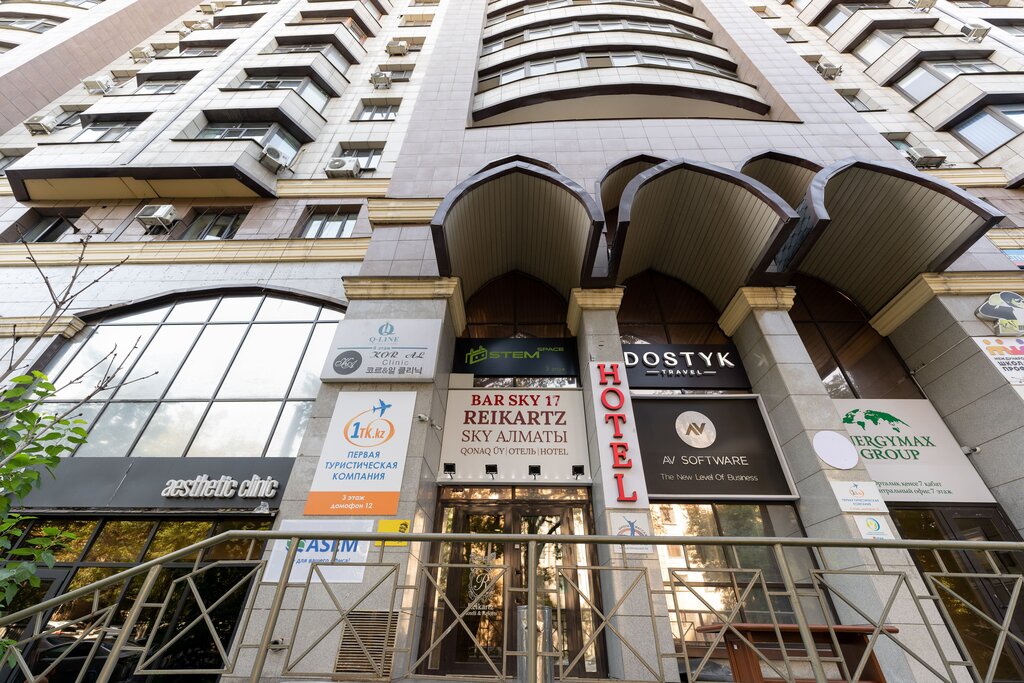 Reikartz Sky Almaty — это компактный современный отель на 42 номера, расположенный на верхних этажах (12–18) многофункционального здания. Отель позиционируется как четырёхзвёздочный бутик с акцентом на панорамные виды и центральную локацию. Ключевая особенность — ресторан и бар Sky 17 на крыше здания (18 этаж) с открытой террасой, который подавляющее большинство гостей называет главным преимуществом отеля.