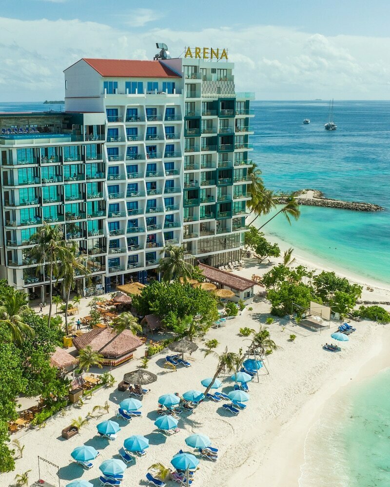 Arena Beach Hotel на острове Маафуши позиционируется как 4-звёздочный отель эконом-сегмента, открытый в 2013 году и частично реновированный в 2021. Это один из крупнейших отелей на острове, состоящий из нескольких корпусов, расположенных вплотную к «бикини-пляжу». Главные козыри — прямой выход к пляжу, наличие двух панорамных бассейнов на крыше с видом на океан, организованные экскурсии и приветливый персонал. Основные претензии гостей касаются соседней стройки, однообразного или слишком острого питания, а также проблем с заселением, выселением и несоответствием некоторых номеров ожиданиям.