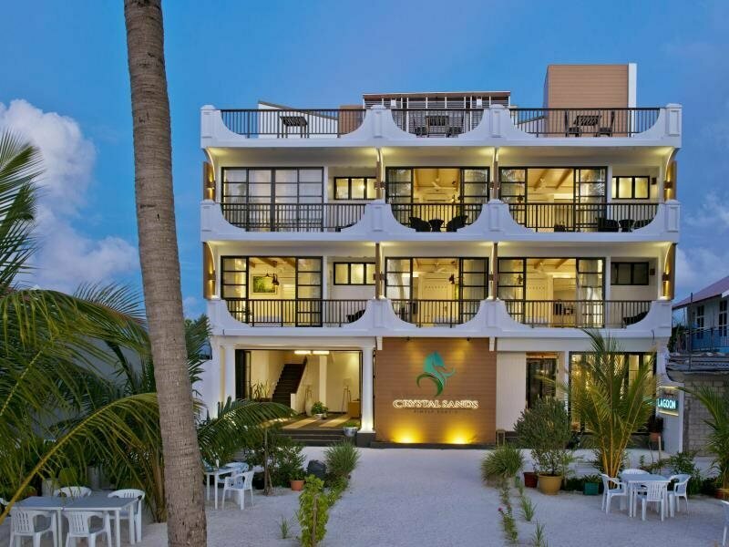 Описание: Отель Crystal Sands — это небольшой (18 номеров) гестхаус, построенный в 2014 году. Он располагается на обитаемом острове Маафуши, что подразумевает полное отсутствие алкоголя на территории отеля и острова в целом. Основной концепцией является предоставление недорогого размещения для туристов, которые большую часть времени проводят в море, занимаясь снорклингом и дайвингом. Многочисленные отзывы подчёркивают, что отель является скорее местом для ночлега, нежели для длительного пребывания в самом номере.