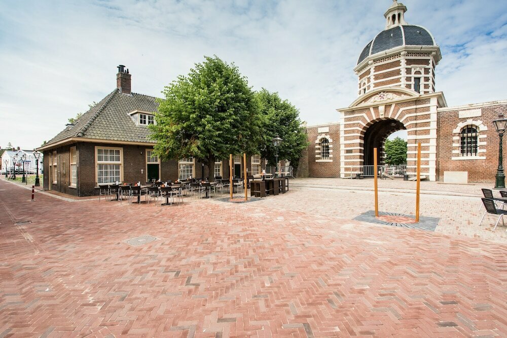Отель расположен в центре Лейдена, у самого входа в старый город (по некоторым отзывам, «на окраине старого Лейдена»). Это тихое и живописное место рядом с каналом (что неоднократно отмечается как плюс), у парка с ветряной мельницей и историческими городскими воротами (Morspoort). Несмотря на центральное расположение, район вокруг самого отеля достаточно спокоен.