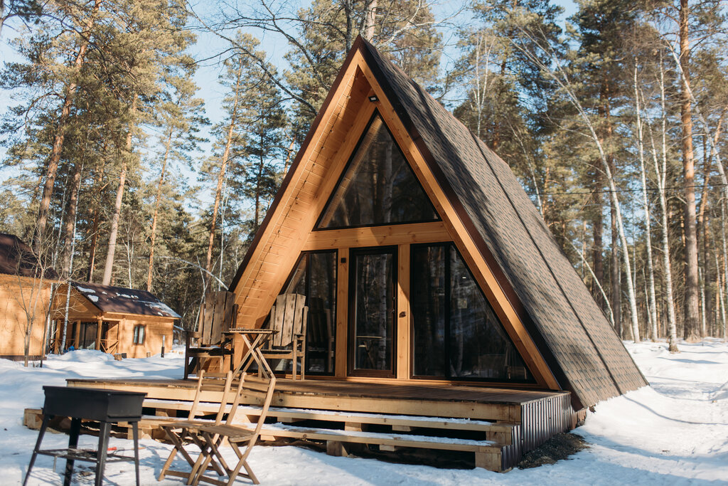 - Для максимального уединения и видов: выбирайте треугольное шале (А-фрейм) с панорамными окнами.