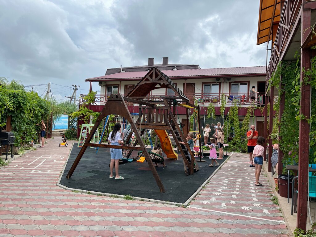 Описание: Небольшой семейный гостевой дом с закрытой территорией, ориентированный преимущественно на семьи с детьми. Главные акценты — наличие бассейна, детской площадки и ежедневной анимации для детей с обеда до вечера. Территория утопает в зелени (виноград, розы, фруктовые деревья), есть беседки и зоны для барбекю. Целевая аудитория — семьи с детьми дошкольного и школьного возраста; пары и молодёжные компании могут чувствовать себя некомфортно из-за жёсткого режима тишины после 22:00 и общего фокуса на детском досуге.
