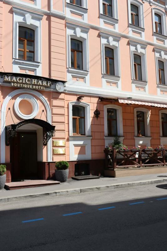 Magic Harp — новый бутик-отель в тихом переулке в центре Москвы, открытый в 2023 году. Отель сочетает элегантный классический дизайн с современными технологиями, делая акцент на уюте и внимании к деталям. Сильные стороны: безупречная чистота, отличная звукоизоляция, удобные кровати с качественным бельём, богатые наборы принадлежностей и приветливый персонал. Завтраки получают высокие оценки, особенно отмечают шампанское и качество блюд. Однако есть и минусы: номера категории «стандарт» довольно маленькие, а уровень сервиса на ресепшене иногда не соответствует позиционированию — встречаются жалобы на недостаточную приветливость и даже небрежное поведение персонала.