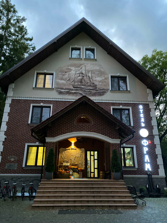 Отель «Фрам» — небольшой трёхзвёздочный гостиничный комплекс в посёлке Отрадное под Светлогорском, позиционирующий себя как тихое место для спокойного отдыха в окружении природы в морском стиле. Это заведение идеально подходит для тех, кто ценит уютную камерную атмосферу, неспешные прогулки и возможность уединения. Главными плюсами отеля подавляющее большинство гостей называют чистые и просторные номера, приветливый персонал (особенно выделяют администраторов Ольгу, Татьяну, Елену) и вкусные, сытные завтраки.