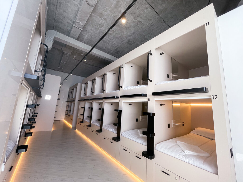Отель предлагает три формата размещения: одноместные капсулы, двухместные капсулы и небольшие комнаты sleeping box. Гости хвалят современность, чистоту и продуманность капсул. Оснащение включает: