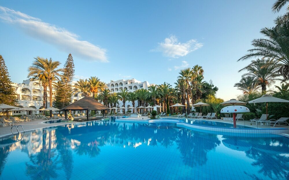 - Расположение: центр города Сус, курортная зона на первой береговой линии; отель окружён живописным пальмовым садом, упирающимся в песчаный пляж