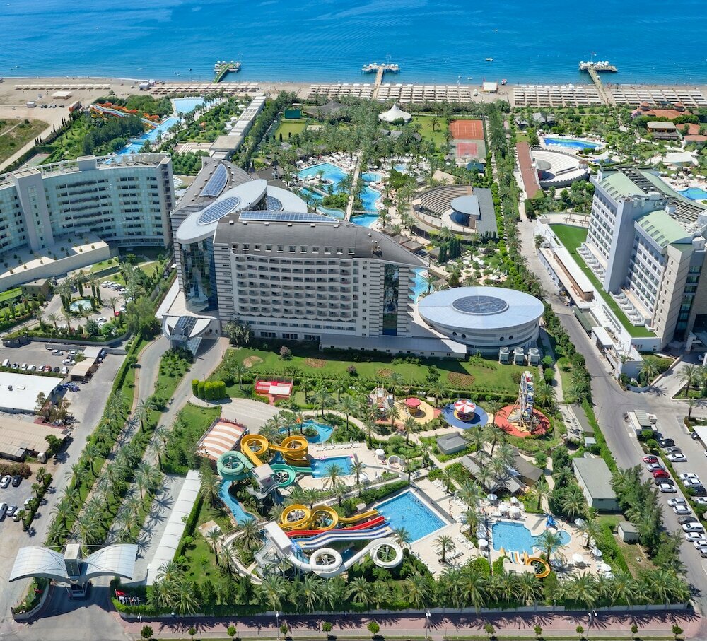 - Инфраструктура для семей: Аквапарк, луна-парк, большие бассейны, мини-клуб.