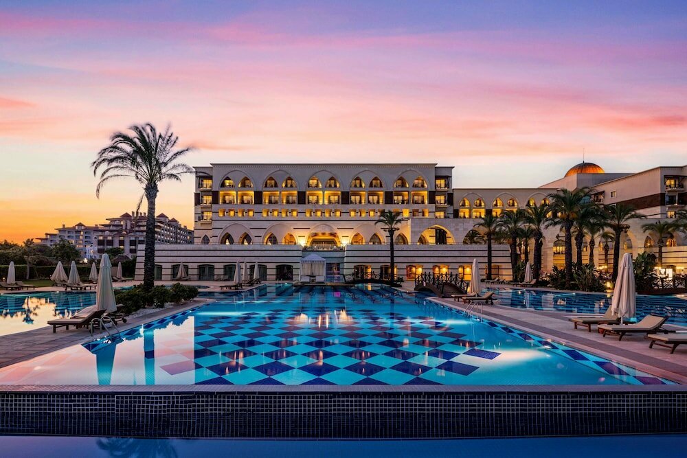Отель имеет средние размеры (228 номеров), что многие гости отмечают как преимущество: здесь нет ощущения огромного мегаполиса, свойственного другим турецким комплексам. Архитектура и интерьеры выдержаны в классическом стиле, первой гостей встречает широкая мраморная лобби-зона с лифтами. Ключевые особенности — наличие собственных гольф-полей, обширного spa-центра, нескольких бассейнов и прямого доступа к оборудованному песчаному пляжу с зонтиками и шезлонгами.