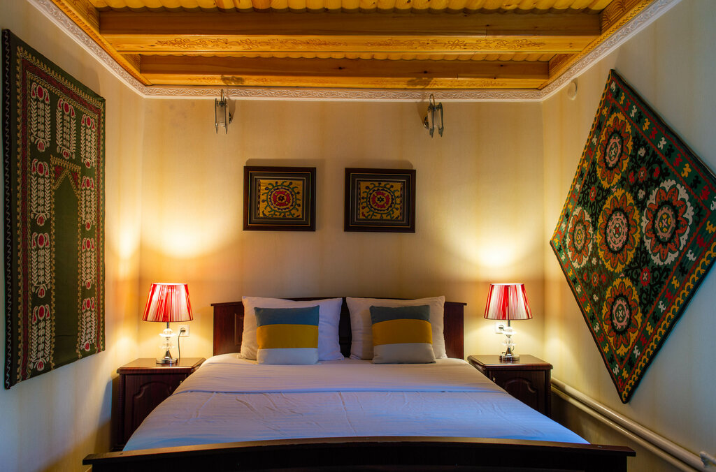 Оформление номеров также выдержано в национальном стиле: используются традиционные узбекские ткани (сюзане), ковры и деревянная мебель, что создаёт ощущение погружения в местную культуру. Несмотря на исторический антураж, в номерах есть все необходимое для комфортного проживания современного туриста. Гестхаус идеально подходит для самостоятельных путешественников, пар, небольших групп друзей и семей, которые хотят ощутить дух восточного гостеприимства и удобно расположиться в пешей доступности от главных достопримечательностей.